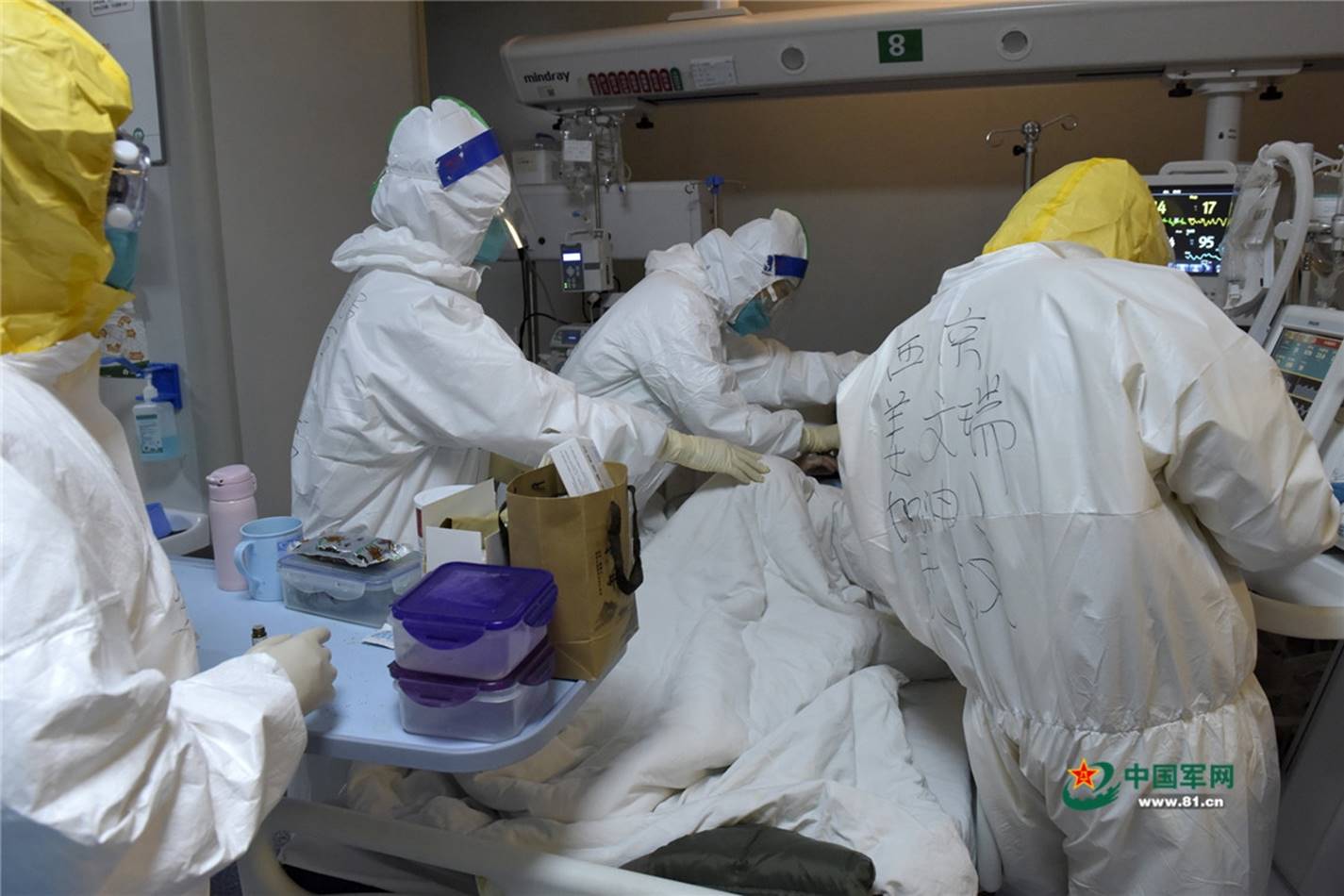 1月30日凌晨2点46分,医疗队队员准备为患者进行生活护理。