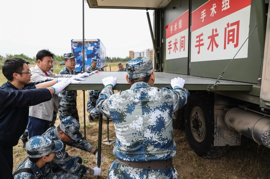 顶着烈日,医疗队先后完成了战备等级转进、摩托化远程机动、卫勤组织指挥、分队部署展开与撤收、15公里野外徒步拉练、批量伤员救治考核、全流程复盘总结、战时政治工作、党史学习教育等15项训练科目。