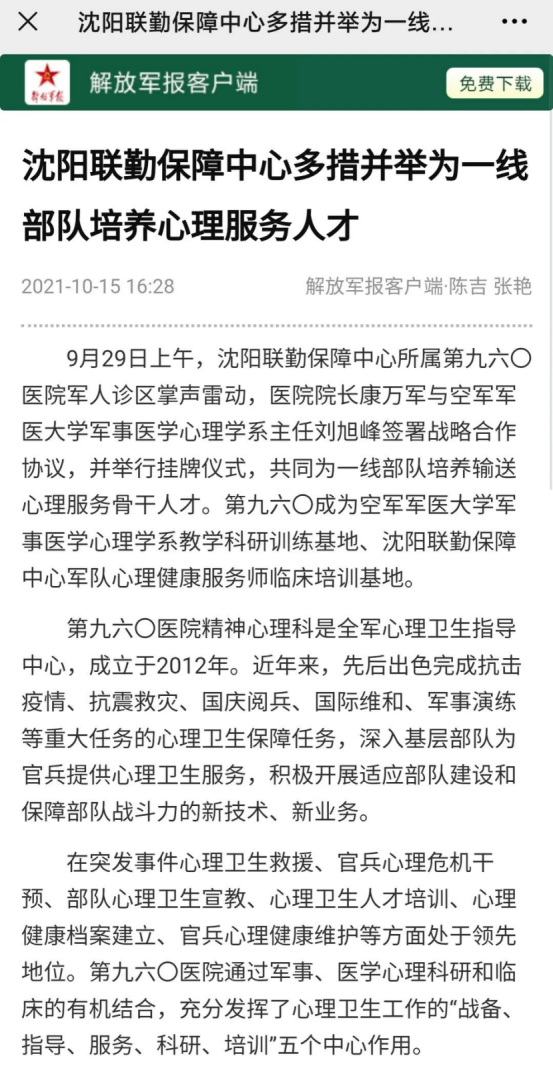 9月29日上午,沈阳联勤保障中心所属第九六〇医院军人诊区掌声雷动,医院院长康万军与空军军医大学军事医学心理学系主任刘旭峰签署战略合作协议,并举行挂牌仪式,共同为一线部队培养输送心理服务骨干人才。第九六〇成为空军军医大学军事医学心理学系教学科研训练基地、沈阳联勤保障中心军队心理健康服务师临床培训基地。