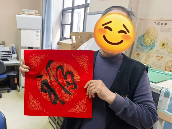 在众多参与者中,68岁的王大爷格外引人注目。他因脑梗住院已两周,平日话不多,但当医护人员递上毛笔时,他颤巍巍地接过,一笔一划写下大大的“福”字:“住院这些天,医生护士待我像亲人,我想把这幅字送给他们,祝大家新年平安。”