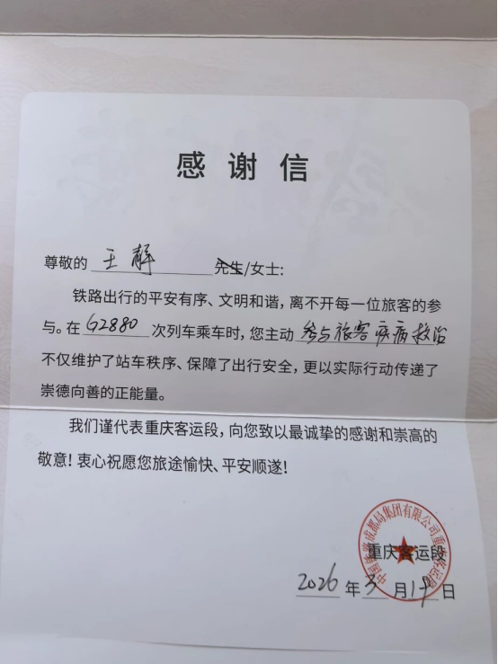 重庆客运段为王静送的感谢信