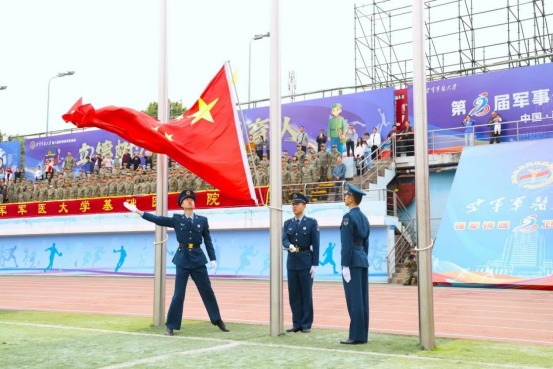 “升国旗、奏唱国歌”。口令划破长空,全场肃立,蓝天军乐团奏响《义勇军进行曲》,音符如雷,旋律如潮。猎猎春风中,鲜艳的五星红旗冉冉升起、迎风招展,全体人员向国旗敬礼,那一刻,热血沸腾,青春滚烫,那一抹红将见证赛场最炽热的梦想与荣光。