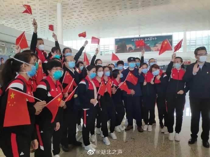 今天,海南援鄂医疗队也开始陆续撤离。上午10点20分,医疗队抵达武汉天河机场。现场,志愿者喊着“感谢海南,向您致敬”,与他们告别。