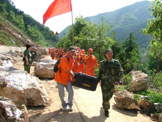 ,跋山涉水深入北川县城,在一座座废墟中展开了搜寻工作。灾害现场环境十分恶劣和危险,但他们发扬我军一不怕苦、二不怕死的连续作战精神,每天仅睡2-3个小时,冒着余震和山体滑坡的危险,克服缺水缺食、无住宿等困难,不辞辛苦,昼夜奋战,“一切为了抢救生命”艰苦地搜寻,搜寻,再搜寻……