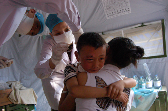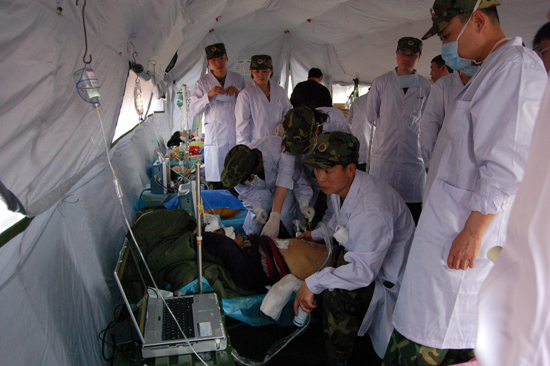 5月24日上午,驻扎在江油的第四军医大学第七医疗队在余震中,为两名受灾群众接生了双胞胎。父母为感谢解放军的救命恩情,为小孩取名为“思国、思军“,“陈奥、陈震”。(李西军摄)