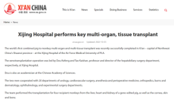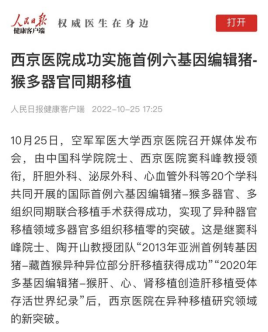 近日,空军军医大学西京医院对外发布,由窦科峰院士领衔,肝胆外科、泌尿外科、心血管外科、麻醉与围术期医学科、骨科、烧伤与皮肤外科、眼科、实验外科等20个学科共同开展的国际首例六基因编辑猪-猴多器官、多组织同期联合移植手术获得成功,实现了国际异种移植领域多器官多组织移植零的突破。该新闻被中央、陕西多家媒体持续关注报道,浏览总量超四百万。此外,稿件经新华社、新华网客户端播发,被新华社土耳其专线、印尼专线、泰国专线、意大利专线分别以当地语言播发。