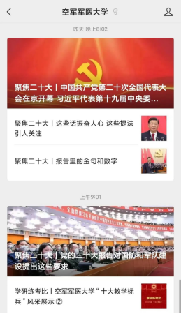 灵活方式,全员跟学。各支部积极响应学校部署安排,灵活开展集中组织与自行观看相结合的方式,收听收看大会开幕盛况,聆听大会报告,开展学习体会交流,推动大会精神进入工作、进入实践。基础医学院政治理论教研室和军队政治工作教研室组织全体政治教员“零时差”学习党的二十大报告,研究大会精神“三进入”措施。