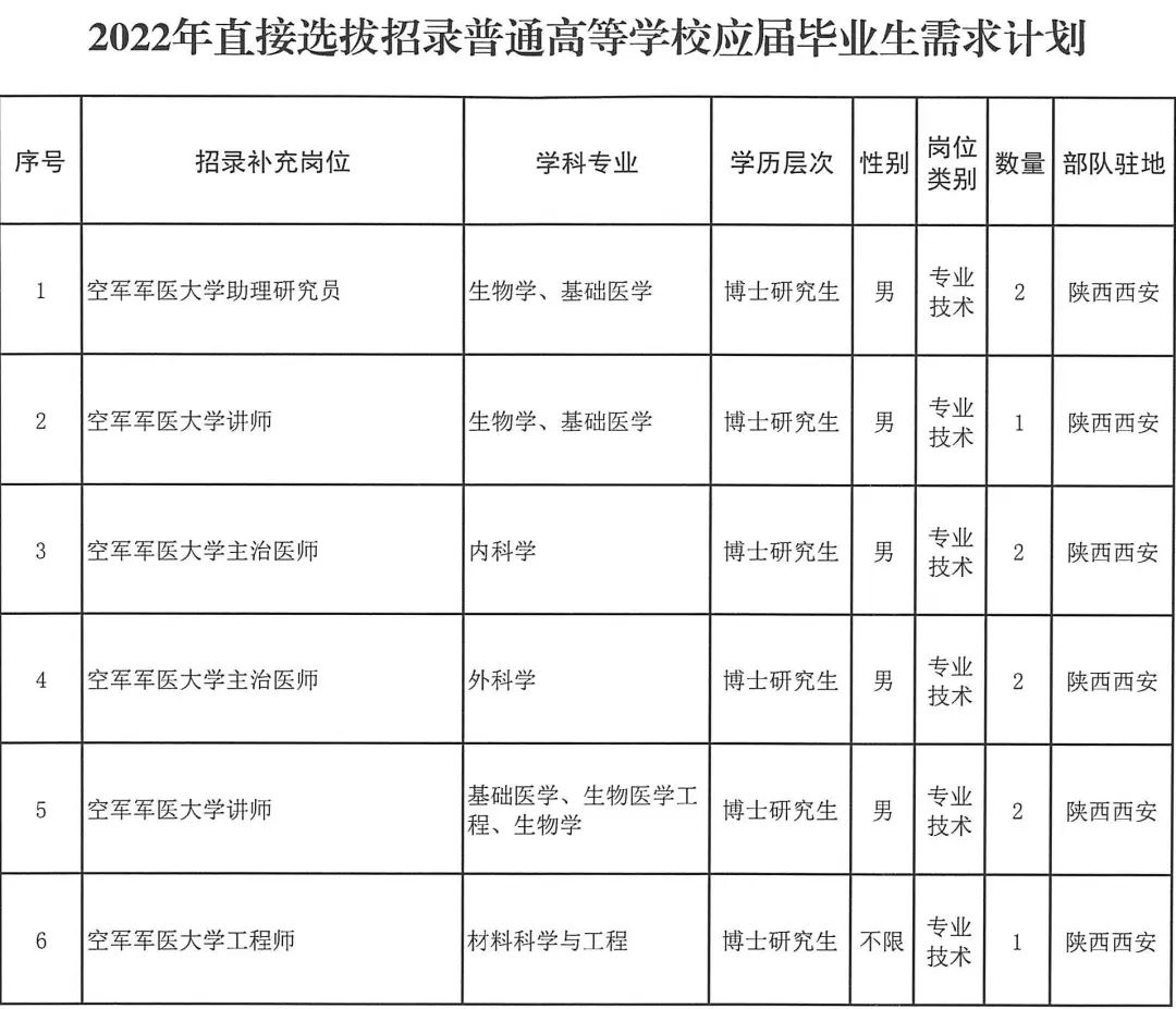 2022年空军军医大学直接选拔招录岗位计划见下表,正式计划最终以军队人才网发布为准。